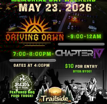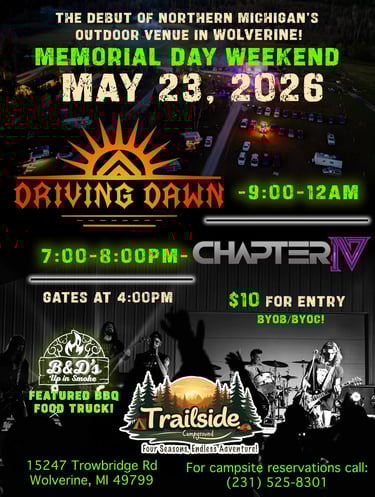Join us for the official debut of Trailside Campground new outdoor concert venue—a high-energy kickoff event featuring live rock performances, great food, and an unforgettable Northern Michigan atmosphere.